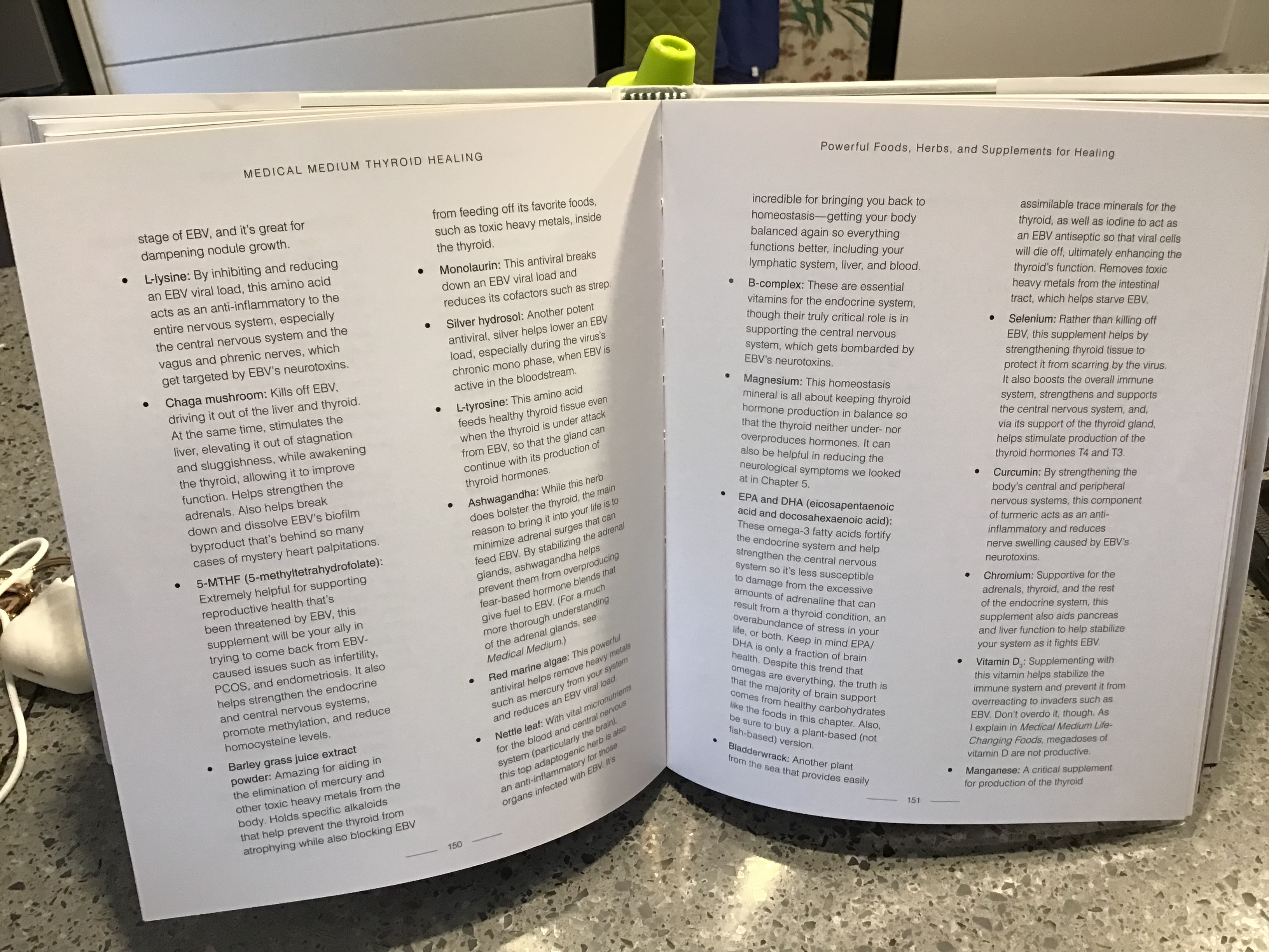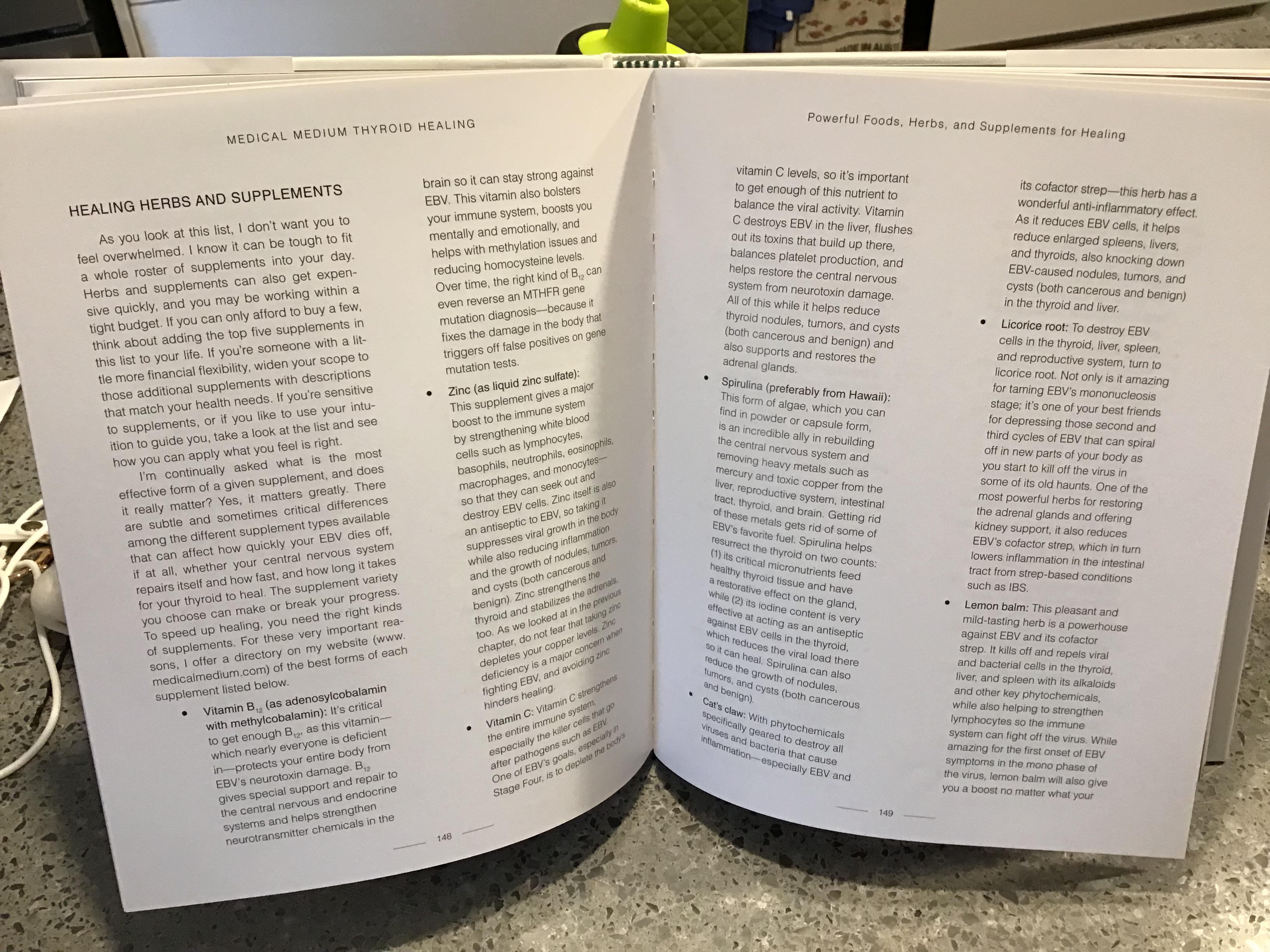 Artichokes and celery are two of the best foods to help restore your thyroid (artichokes) and cleanse your body of EBV toxins (celery). The other food allies for the thyroid (as Anthony describes them) are: aloe Vera, apples, arugula, asparagus, Atlantic sea vegetables, avocados, bananas, basil, berries, cauliflower, coriander (cilantro), coconut, cruciferous vegetables, cucumbers, dates, fennel, figs, garlic, ginger, hemp seeds, kale, lemons and limes, lettuce, mangoes, maple syrup, nuts, onions and scallions, oranges and tangerines, papayas, parsley, pears, pomegranates, potatoes, radishes, raw honey, sesame seeds, spinach, sprouts and micro greens, squash, sweet potatoes, thyme, tomatoes, turmeric, watercress, and wild blueberries. There are also many healing herbs and supplements which I have captured in the below pics from the book: