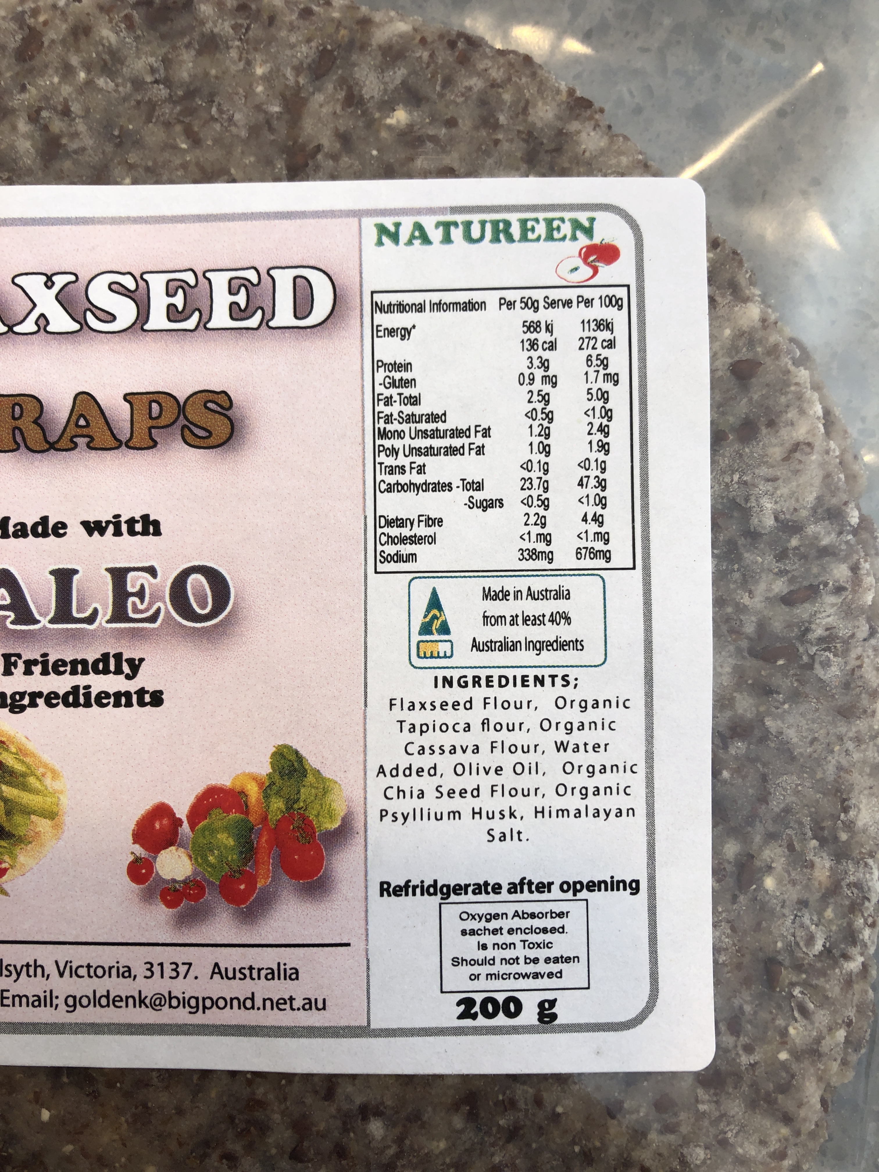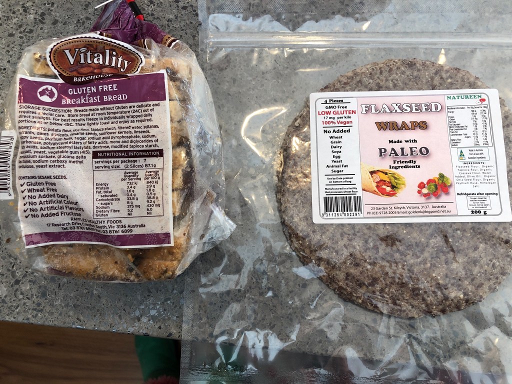 Gluten alternatives had proven difficult. I have been gluten-free for over a year now but my regular gluten-free breads and pasta options are now not suitable for the Thyroid Healing cleanse as most of the gluten-free products also contained dairy, eggs, soy, corn and/or canola! I had pretty much decided I would just not worry about bread all together after standing at the gluten-free bread isle in the supermarkets for quite some time reading all the ingredients in each brand of gluten-free bread! (Yes I was determined and I really love toast with smashed avocado!!) This process actually proved easier and quicker than any google search (which came up nil using my search criteria)! In Hobart I went to Coles, Woolworths and IGA with no luck. I even rang Eumarrah Health Food store in Hobart City with no luck. Until I decided to check out Salamanca Fresh in Bellerive to pick up some fruit and veg close to where I live, and found they also sold gluten-free breads. After a minute of browsing, I came across these two bad boys….