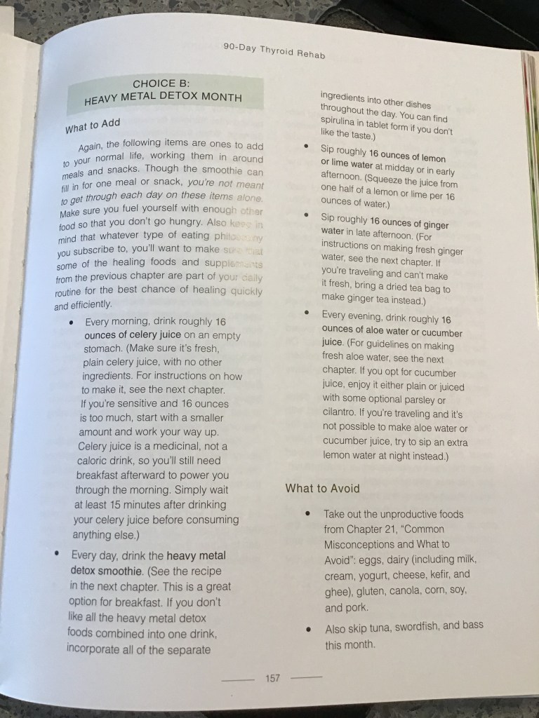 Yesterday I entered Week 5 and started the Choice B – Heavy Metal Detox month (pictured below). There are no teas or soups this month but I will continue to have the Thyroid Healing tea from Choice C, as part of my morning tea routine, along with the Thyroid Healing broth as well.