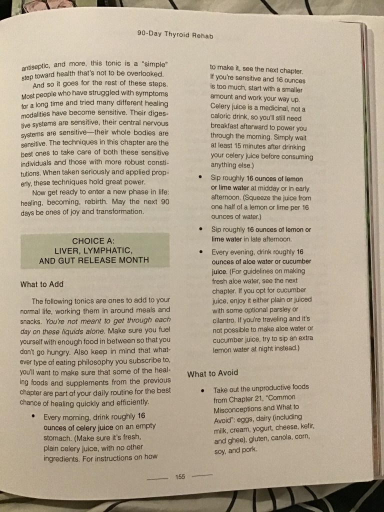 Next week I stop taking the T3 hormone as well so it will be interesting to see how that evolves. I also start the thyroid healing Cleanse A – Liver, Lymphatic and Gut Release Month. This cleanse is the most gentle and easiest in regards to cleansing and food/juice preparations.